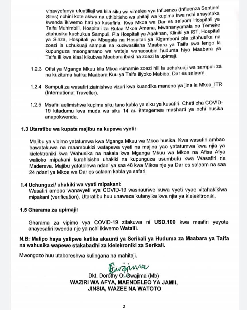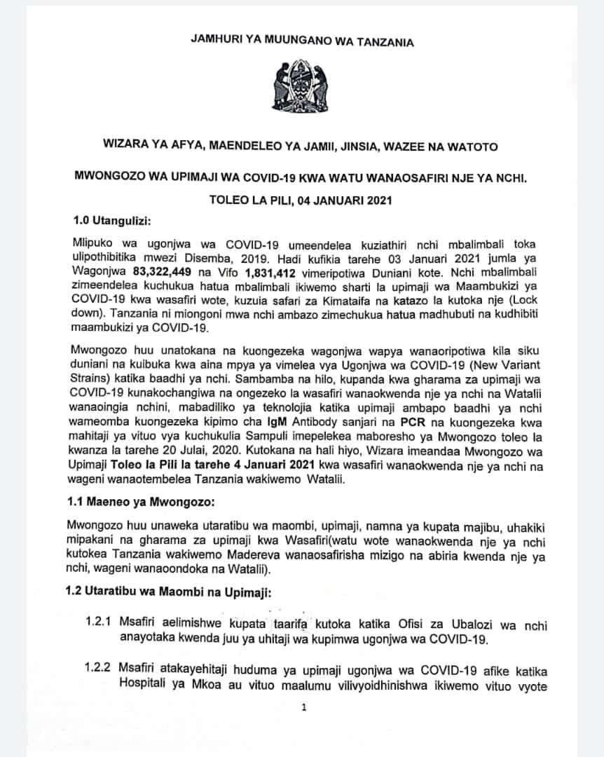 TAARIFA JUU YA MWONGOZO WA UPIMAJI WA COVID-19 KWA WASAFIRI NJE YA TANZANIA
