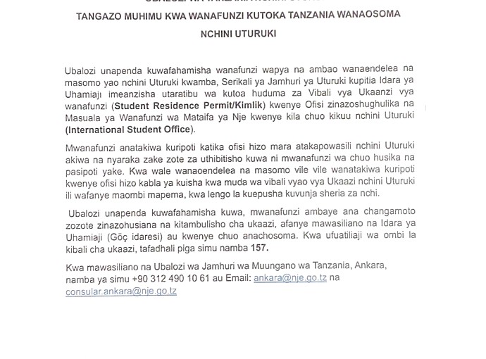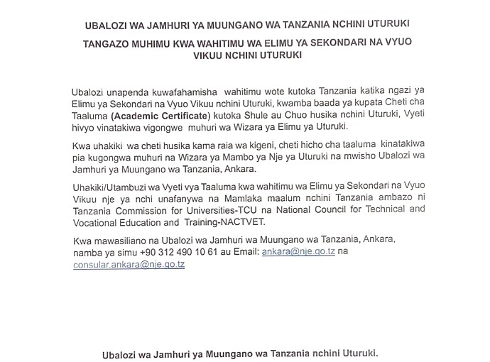 Tangazo muhimu kwa wahitimu wa Elimu ya Sekondari na Vyuo Vikuu nchini Uturuki