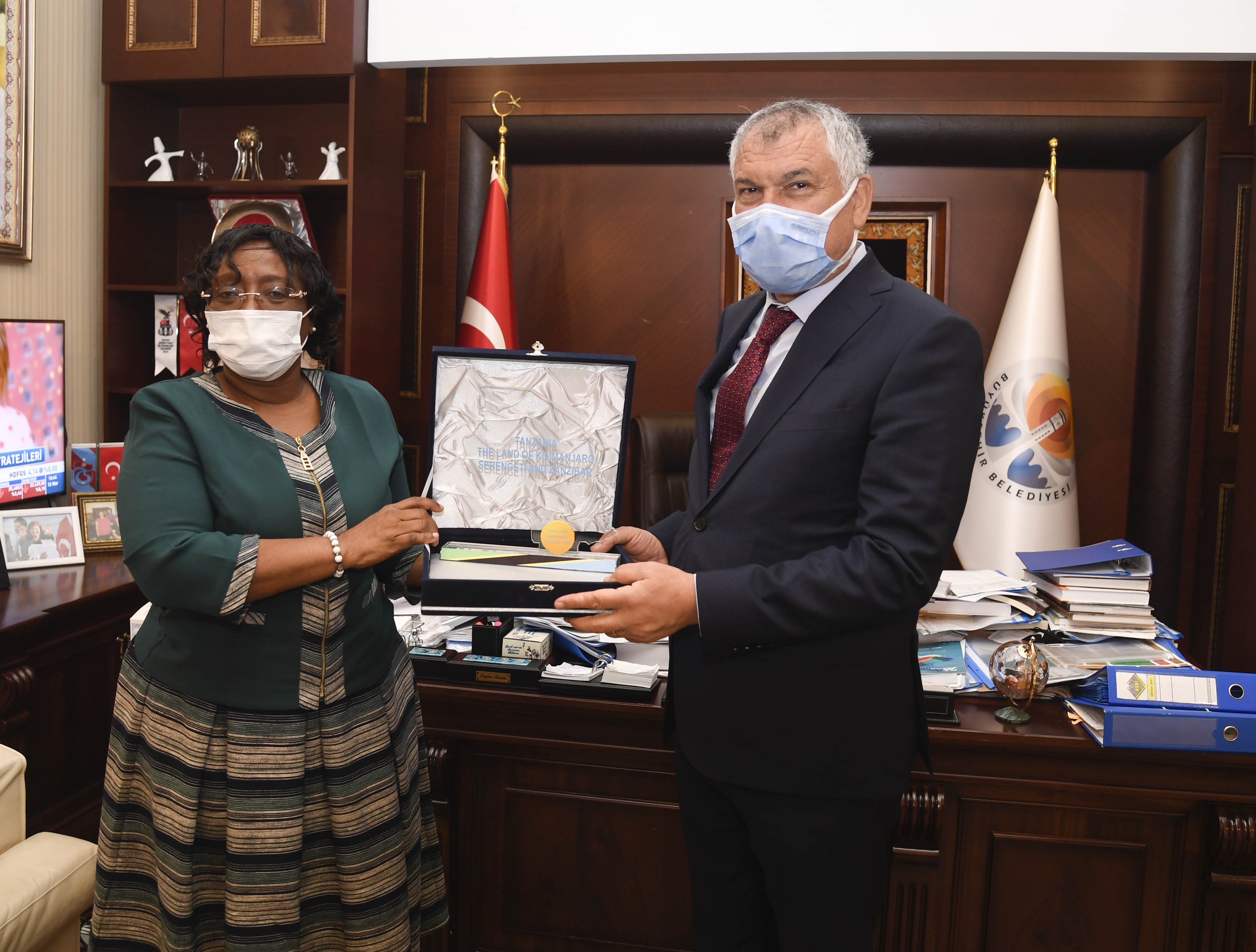 H.E Prof. Kiondo handing a Tanzania map to the Mayor of Adana Mr. Zeydan Karalar at Mayor's office.