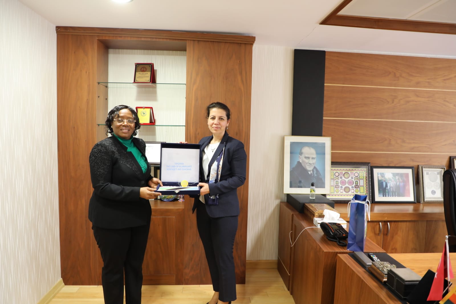 Ambassador Kiondo handing a Tanzania map to the General Manager of BETA Tea company Ms Ersoz at their Headquarters in Adana.