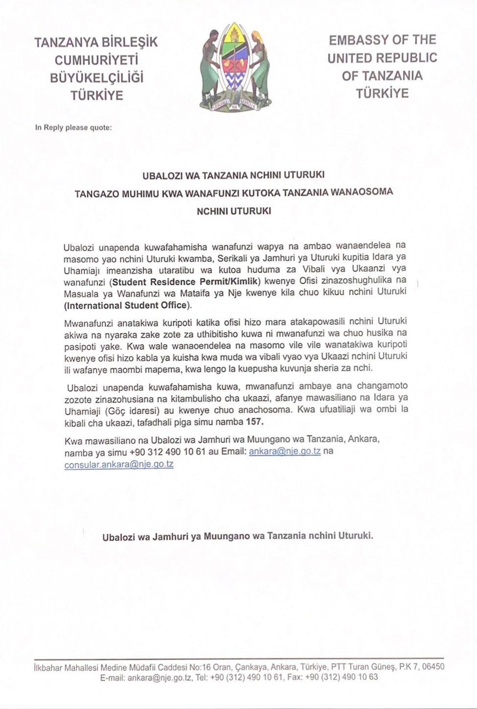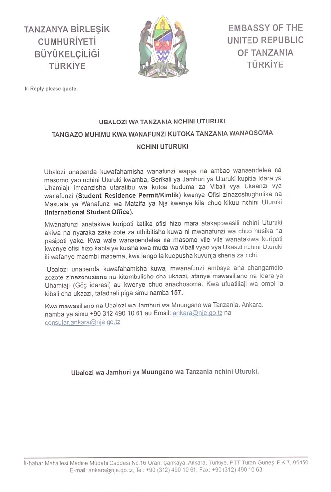 Tangazo muhimu kwa wanafunzi kutoka Tanzania wanaosoma nchini Uturuki